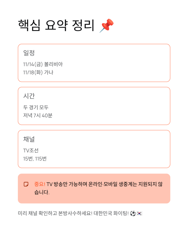 - ✅ 일정: 11/14(금) 볼리비아, 11/18(화) 가나