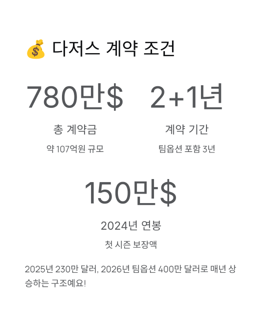 연봉도 매년 오르는 구조예요. 2024년 150만 달러로 시작해서 2025년 230만 달러, 팀옵션인 2026년에는 400만 달러까지 오르는 구조입니다.
