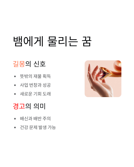 - 뱀에게 물리는 꿈 : 뜻밖의 재물이나 사업 번창의 길몽, 그러나 배신과 질병 경고일 수도 있어요.