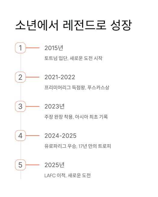 특히 2021-2022시즌에는 프리미어리그 득점왕에 올랐어요. 아시아 선수 최초이자 현재까지 유일한 대기록이죠. 같은 시즌에 번리전에서 터뜨린 골로 푸스카스상까지 받았고요. 이것도 아시아 선수 최초예요. 그리고 지난 2024-2025시즌에는 주장으로서 유로파리그 우승 트로피를 들어올리면서 토트넘에 17년 만에 메이저 대회 트로피를 가져다줬어요!