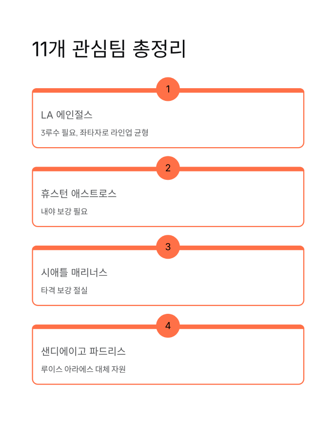 - LA 에인절스: 3루수가 필요하고 좌타자를 영입해 우타자 많은 라인업 균형을 맞추려 함