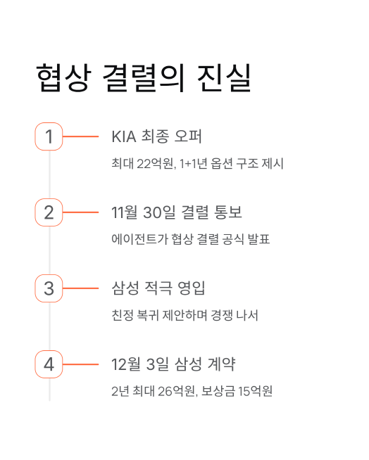 최형우 FA 협상은 어떻게 결렬된 걸까요? 2025시즌이 끝나고 최형우는 FA 자격을 얻었어요. KIA는 당연히 잔류 협상에 나섰죠. 최대 22억원이라는 큰 금액을 제시했지만, 11월 30일 최형우 측 에이전트가 "협상 결렬"을 통보했어요. 동시에 삼성 라이온즈가 친정 복귀를 제안하며 적극적인 영입 경쟁에 나섰다는 보도가 나왔죠.