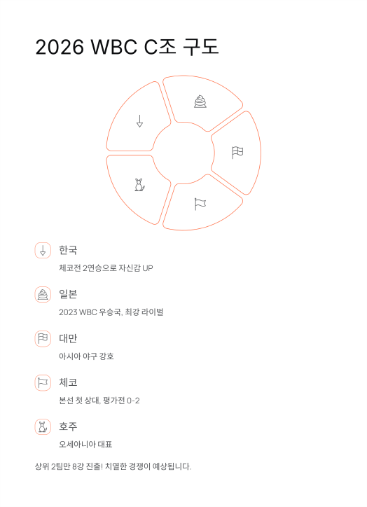 한국은 2026년 3월 WBC 본선 1라운드에서 C조에 속해 있어요. 체코, 일본, 대만, 호주와 함께 경쟁하는데, 이 중 상위 2팀만 8강이 겨루는 2라운드에 진출할 수 있답니다. 경쟁이 정말 치열하죠!