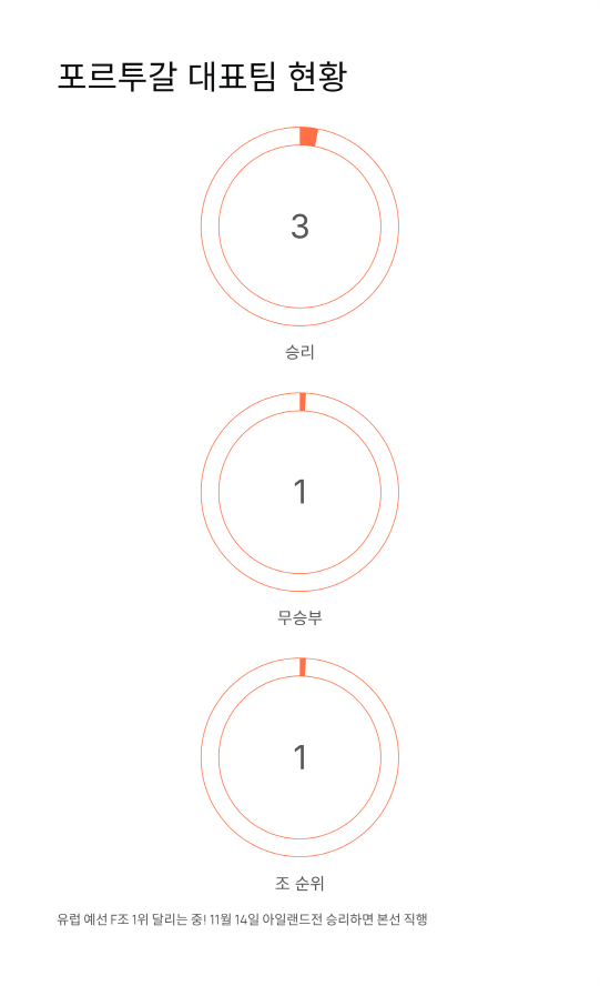 지금 유럽 예선 F조에서 3승 1무로 1위 달리고 있어. 11월 14일 아일랜드만 이기면 본선 직행! 마르티네스 감독 체제에서 호날두는 여전히 주전이야. 은퇴 선언 후에도 집중력은 그대로인 듯.