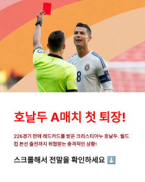 호날두는 클럽 무대에서 13차례 퇴장을 경험했지만, A매치에서는 이번이 처음이에요. 22년 선수 생활, 226경기를 뛰면서 단 한 번도 국가대표팀에서 퇴장당한 적이 없었는데 말이죠!