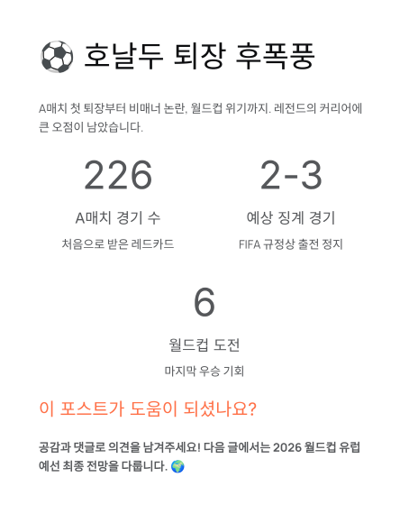 호날두는 최근 "2026 북중미 월드컵이 나의 마지막 월드컵"이라고 선언했어요. 6번째 도전에서 처음이자 마지막 우승을 노리는 호날두에게 이번 퇴장은 정말 뼈아픈 사건이에요.