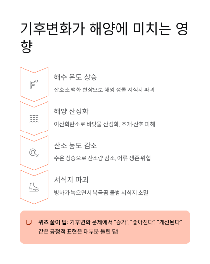 기후변화가 해양 생태계에 미치는 영향을 생각해보세요. 바다 온도가 올라가면 해양 생물들에게 어떤 영향을 미칠까요?