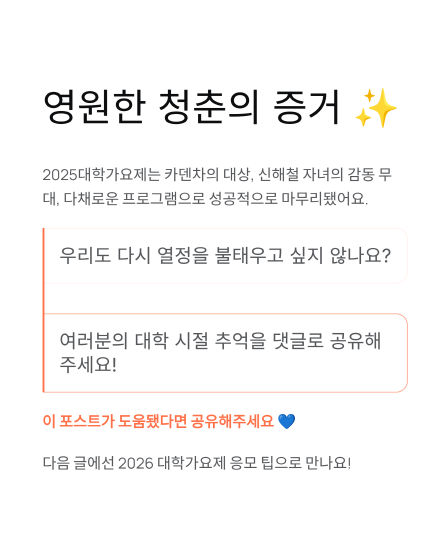 2025 대학가요제는 청춘의 에너지, 레전드 뮤지션의 유산, 그리고 새진 세대의 음악적 꿈까지 모두 합쳐진 무대였어요.